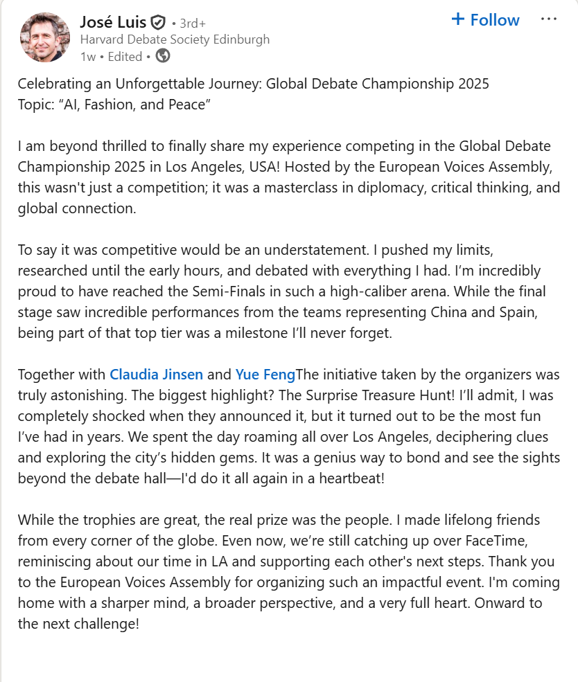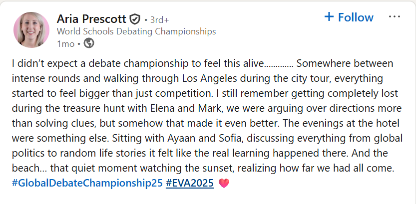 Exclusive opportunities to connect with international debaters, students, professionals, and delegates from diverse backgrounds while building meaningful global networks and cross-cultural collaborations.